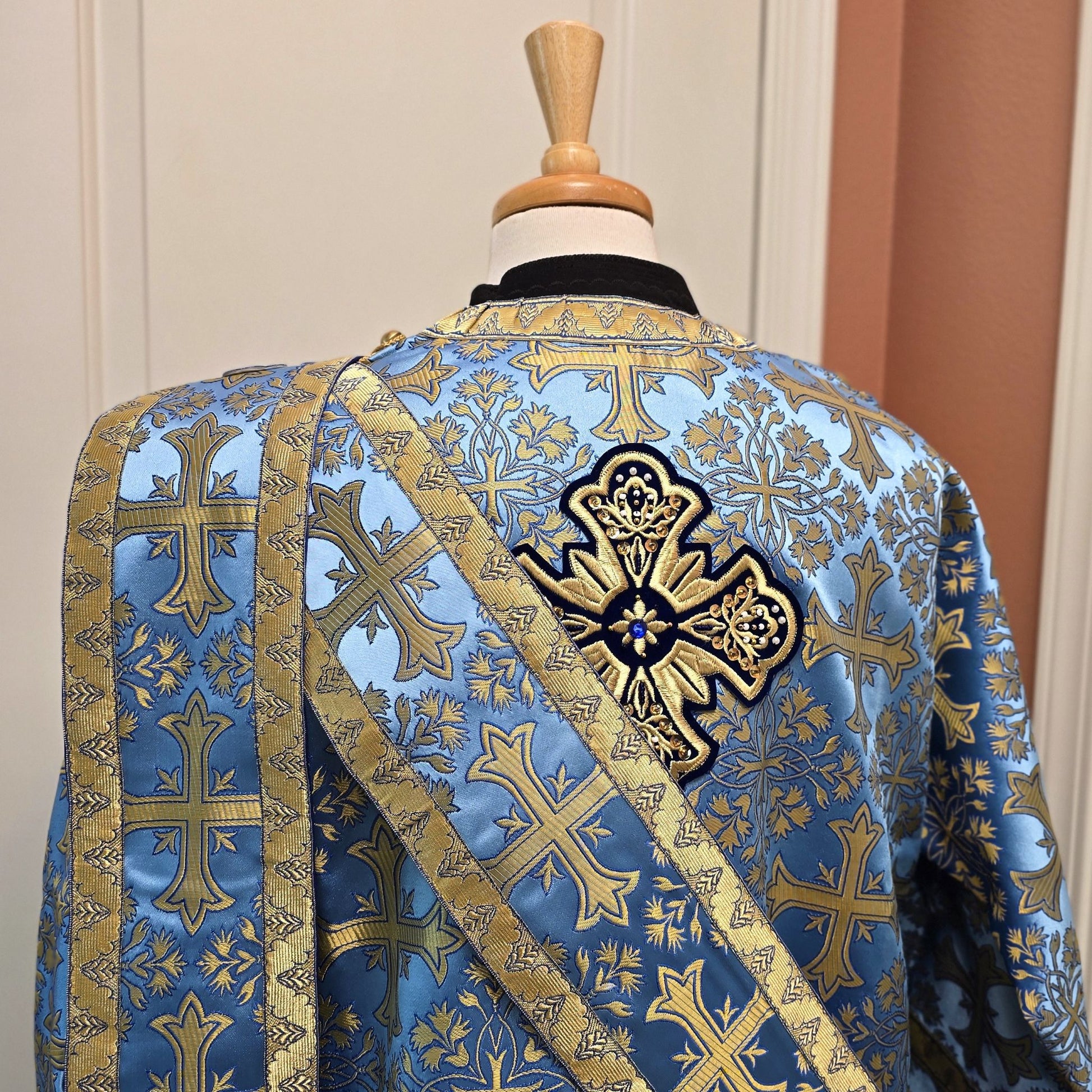 High quality, affordable sticharia (robes) from brocade imported from Greece that will provide many years of beautiful service. Deacon set includes 1 robe, 1 orarion (finished with 7 crosses, fully lined and interfaced, and finished with galloon around entire perimeter and double banks of fringe at each end), 1 pair of cuffs. This set has specialty embroidered crosses.